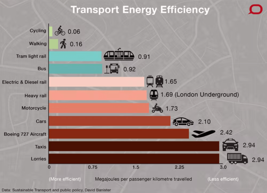 Cycling is the most energy-efficient form of transport ever used by humans, requiring between one third to one half of the energy required for walking the same distance.